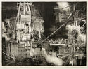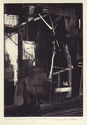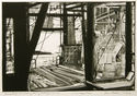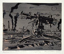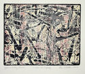 "I have [been] making these unique prints since 1985 but worked in a painterly additive manner until 1997 when I came around to working reductively (Black Manner) from a rolled-up solid black ink, with tools at hand. This was at a demonstration in Pennsylvania. It sort of surprised me as discoveries do at times, and I soon began to layer the marks to suggest deeper space. The tools themselves suggested an architectural solution to the image, though I had already been gravitating toward this in painting. The urban over the pastoral. I have taught art history in California and in London so I am acquainted with a good deal of referential touch stones, if you will. I also collect prints but I have no aid to my composing an image when working, so if Piranesi, Caneletto, Goya, or Brangwyn might be suggested, it is only that the drama occurring in my action / reaction, direct making of the image found this a way of solving the pictorial "chess match." I have little in mind at the outset, turning the Plexiglas as I work in my removal and re-instatement of the ink. I try to keep my vision open (unlocked) and not "wish" an image into being. It often comes obliquely into view.