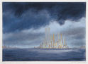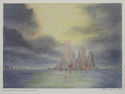 During WWII Geerlings did pioneering work with the U.S. Air Corps on aerial perspective drawings and maps, developing the Target Identification Unit for the Air Force. After the war he continued as a consultant to the SAC and returned to his architecture as well as doing a series of lithographs into the 1980's. One series, Siren on the Sea features the featuring the lower New York skyline and the World Trade Center twin towers, each lithograph colored uniquely with pastel to reflect different times of day.